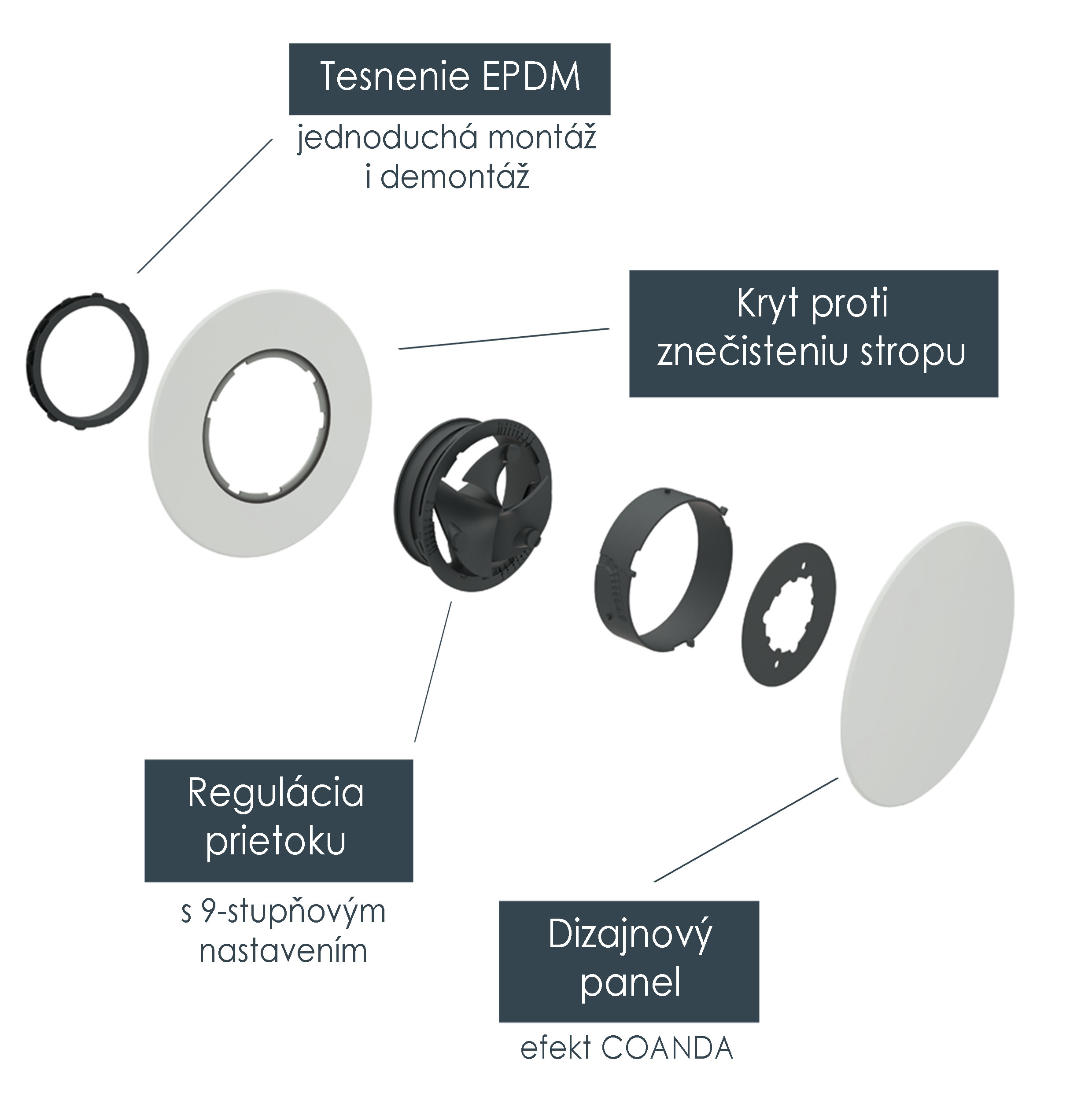 Ventily Haelix sú navrhnuté tak, aby zabezpečovali rovnomernú distribúciu vzduchu. Dodávajú sa v nadčasovom dizajne a sú k dispozícii v kruhovej a štvorcovej verzii. Inštalácia je bez použitia náradia, jednoduchým zasunutím ventilu do akéhokoľvek štandardného adaptéra s priemerom 125 mm. Okrajová príruba prispieva k zabráneniu usadzovania nečistôt na omietke. Vzduch je privádzaný cez špeciálne tvarované lopatky tak, aby bol rozvádzaný v miestnosti rovnomerne využitím tzv. efektu "Coanda". Po uvedení systému Air Excellent do prevádzky a po nastavení obmedzovacích krúžkov sa ventily Haelix ľahko nainštalujú vložením strany tesniaceho krúžku EPDM do adaptéra ventilu, čo zaručuje pripojenie bez netesností. Haelix obsahujú dodatočný 9-stupňový obmedzovač vzduchu, ktorý je schopný prispôsobiť sa nepredvídaným systémovým odchýlkam v dôsledku zmien v inštalácii a vytvoriť tak najvyššiu kompatibilitu s akýmkoľvek ventilačným systémom. Vhodný pre aplikáciu na prívod a odvod vzduchu: |