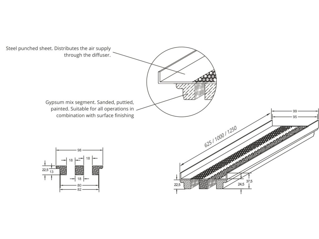 Difúzor VENTMANN LINE je dostupný s rôznym počtom štrbín a v rôznych dĺžkach. Verzia SLIM je ideálna, ak chcete mať difúzory prakticky neviditeľné. Naopak, z difúzorov môžete vytvoriť dizajnový prvok. Napríklad naše difúzory LINE môžu byť použité na vytvorenie súvislého líniového prvku.