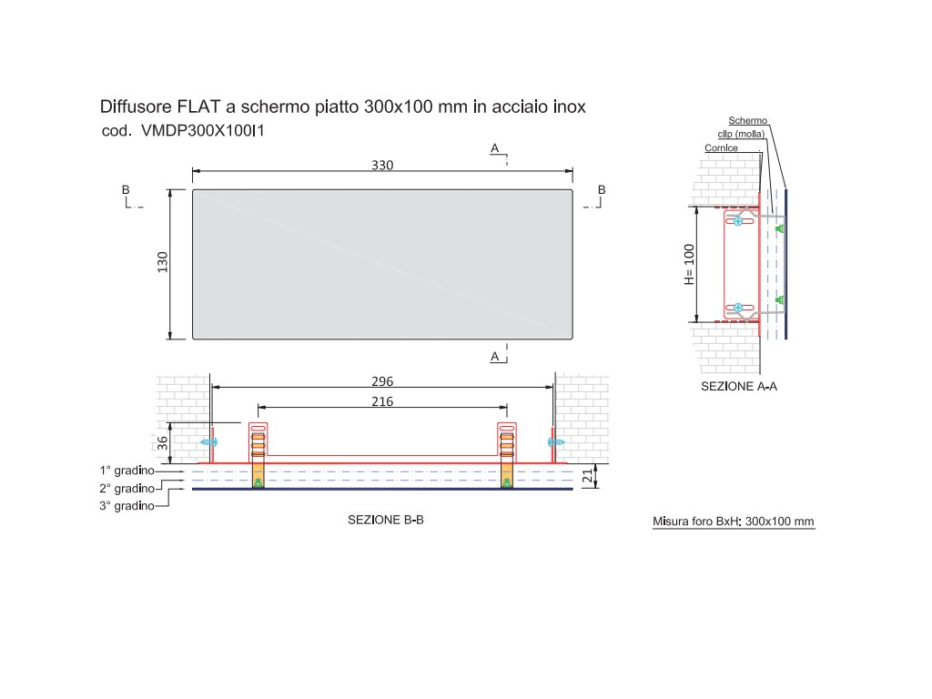 Materiál : nerez Rozmer difúzora : 330x130mm Pripojovací rozmer : 300x100mm Prietok pri 3m/s : 126 m3/h |
