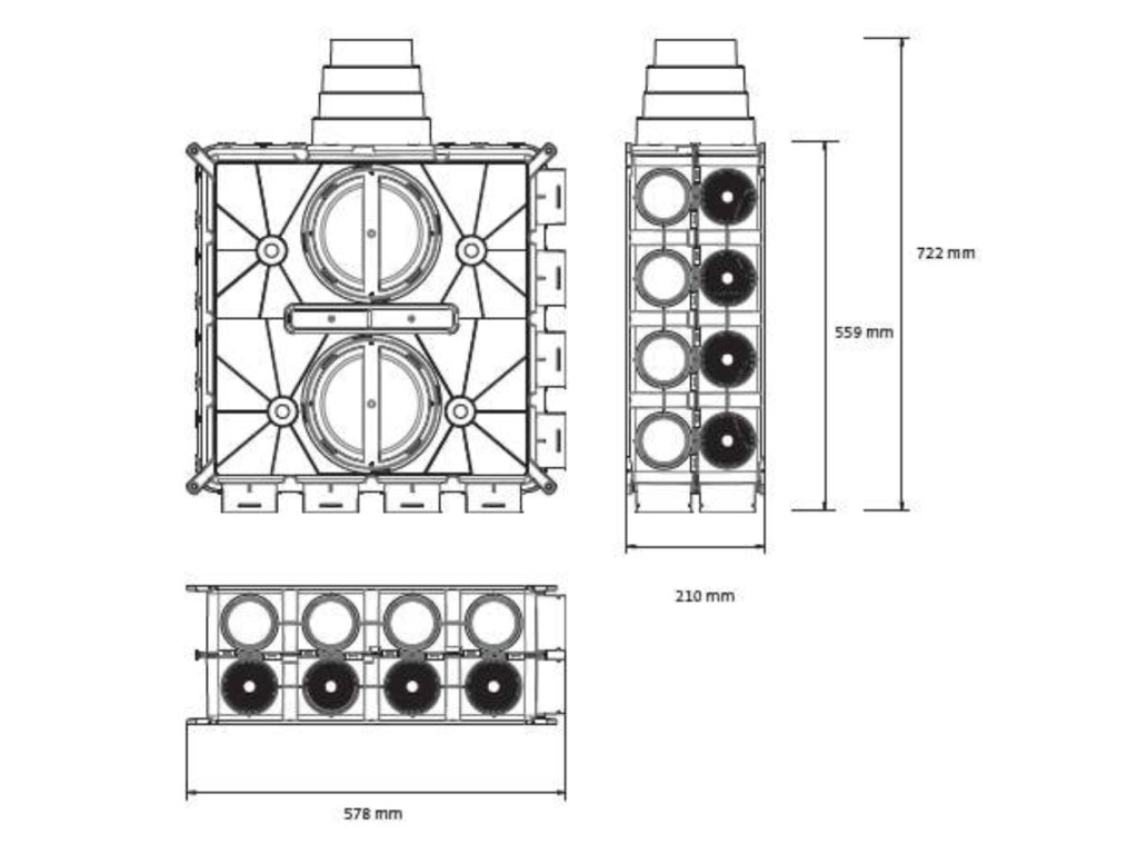 | Pripojovacie hrdlá: | 16xDN75mm / DN90mm / 50x140mm |